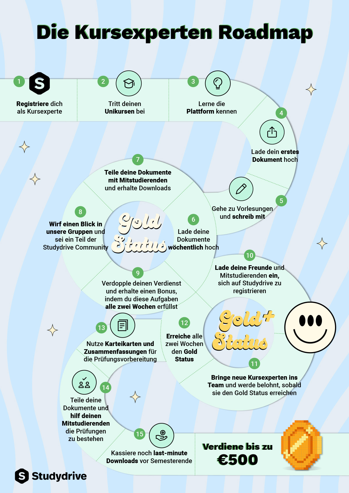 - 10 Beiträge oder Kommentare in deinen Gruppen/Kursen auf Studydrive posten