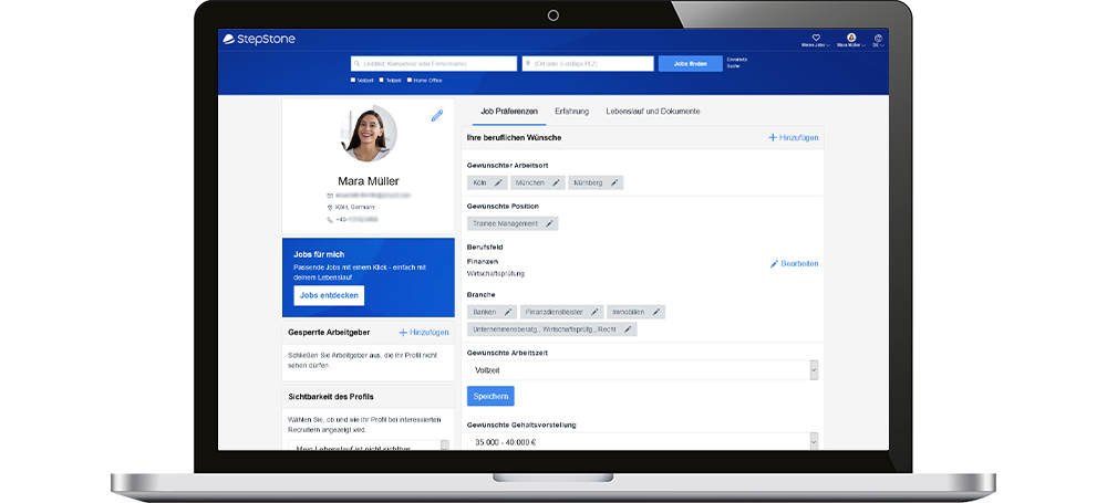 Das geht viel einfacher. In deinem StepStone Profil gibst du nur einmal deine Erfahrungen und Wünsche an und erhältst anschließend bei jedem Besuch auf der Seite dazu passende Jobs. Neben deiner Ausbildung und Berufserfahrung berücksichtigt der StepStone Algorithmus bei der Auswahl auch deine Wünsche und Präferenzen zu Stellenbezeichnungen, Arbeitsorten, Gehalt und vielen weiteren Faktoren.