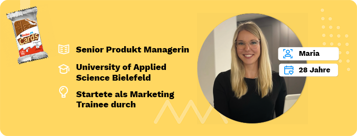 Maria: Ich stieg nach meinem Bachelorstudium mit einem Praktikum im Marketing bei der Marke kinder Seasonal ein - also in der bunten Welt der Osterhasen und Weihnachtsmänner von kinder.